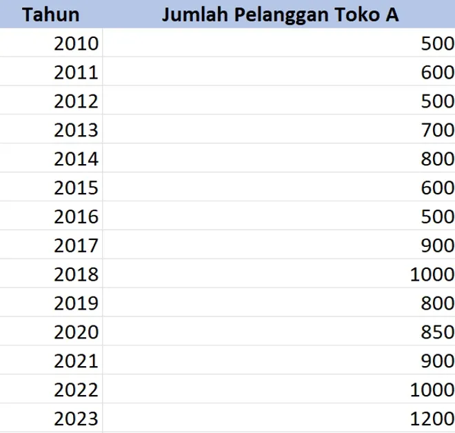 Pilih data yang ingin ditampilkan dalam diagram garis, misalnya seperti data jumlah pelanggan toko A di bawah ini: