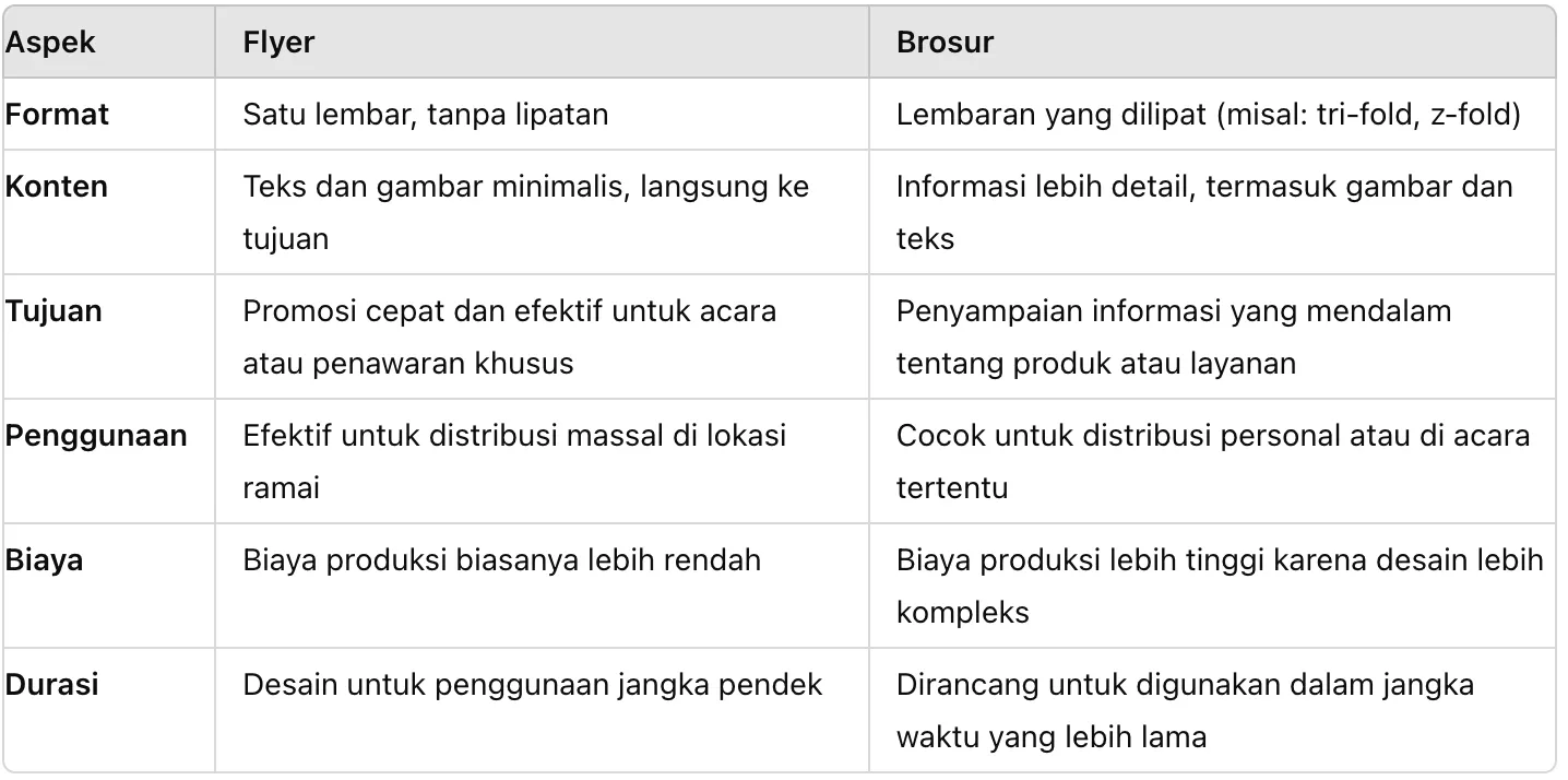 Berikut perbedaan flyer dan brosur dalam bentuk tabel: