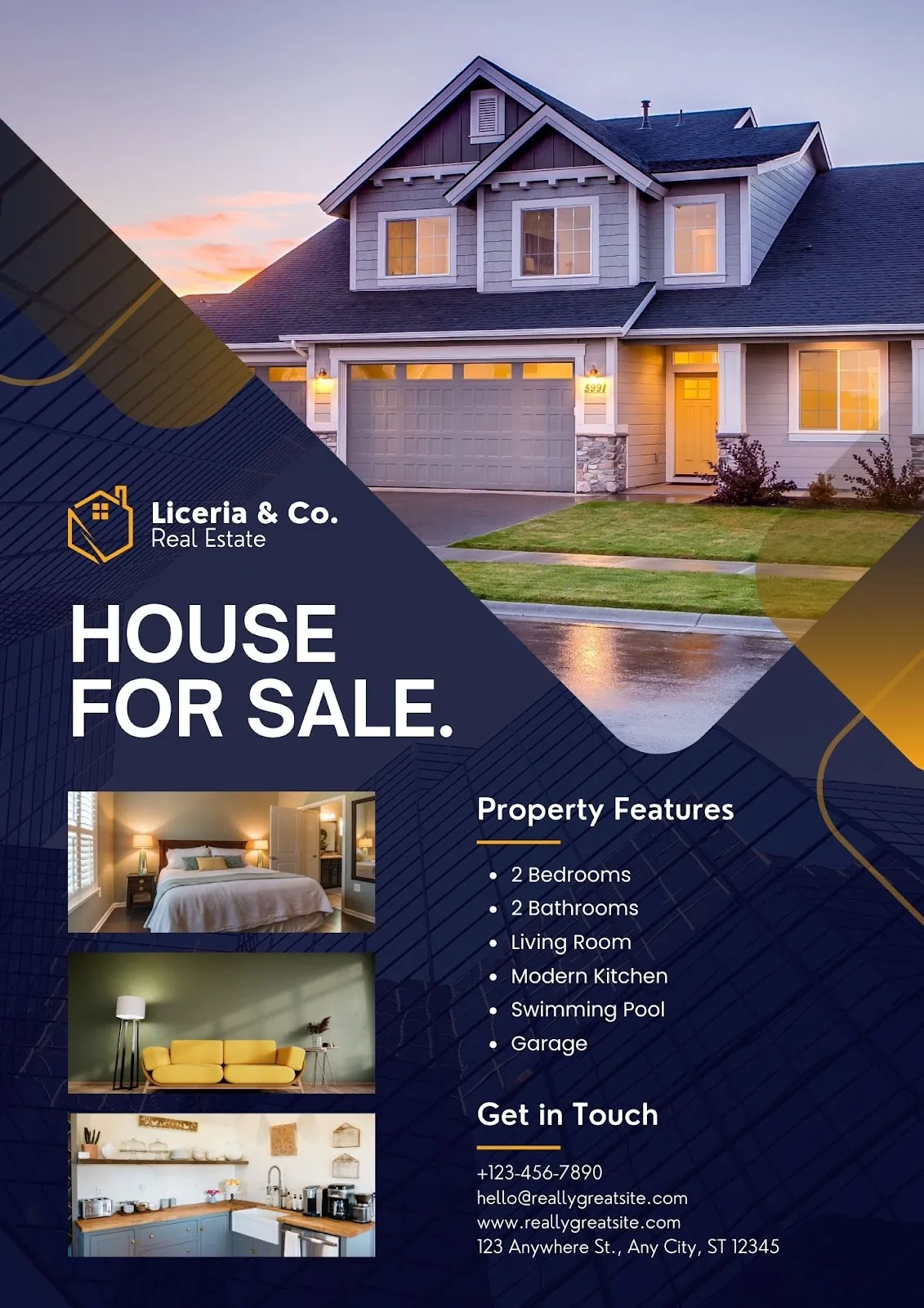 Desain flyer ini elegan, dengan gambar rumah pada waktu matahari terbenam yang memberikan nuansa hangat dan mewah. Informasi tentang fitur properti dan kontak agen tersaji dengan jelas, memudahkan calon pembeli untuk menindaklanjuti.
