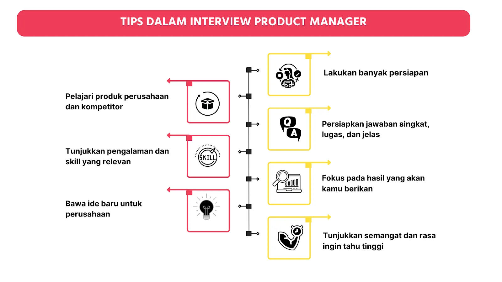 Product manager perlu memiliki skill komunikasi yang hebat. Saat interview, kualitas jawaban kamu ditentukan oleh seberapa jelas dan lugasnya kamu dalam menjawab pertanyaan.