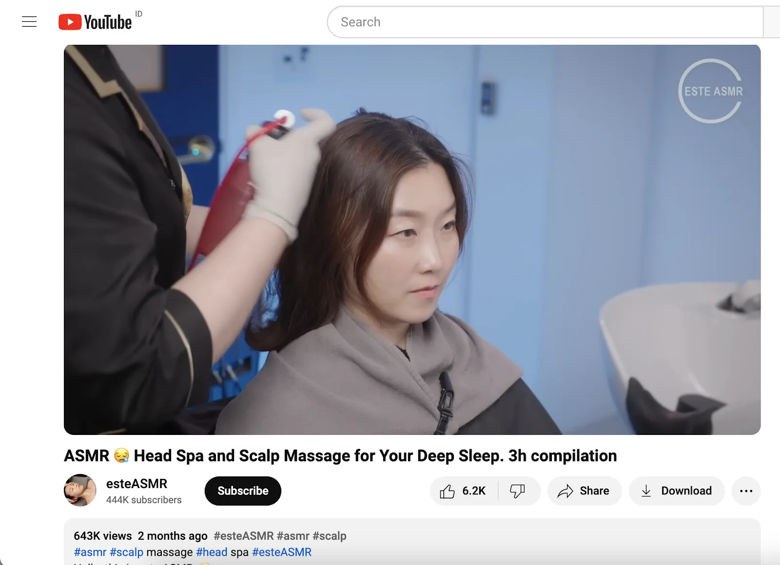 Gambar di atas menunjukkan video ASMR spa dan pijat kulit kepala. Ini adalah jenis konten ASMR yang ditujukan untuk menyediakan relaksasi dan membantu penonton tertidur lebih nyenyak.