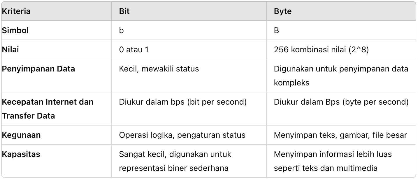 Bit adalah unit dasar dalam komputasi yang mewakili nilai biner 0 atau 1. Sedangkan byte adalah kumpulan dari delapan bit yang dimanfaatkan untuk menyimpan data lebih kompleks seperti satu karakter teks.