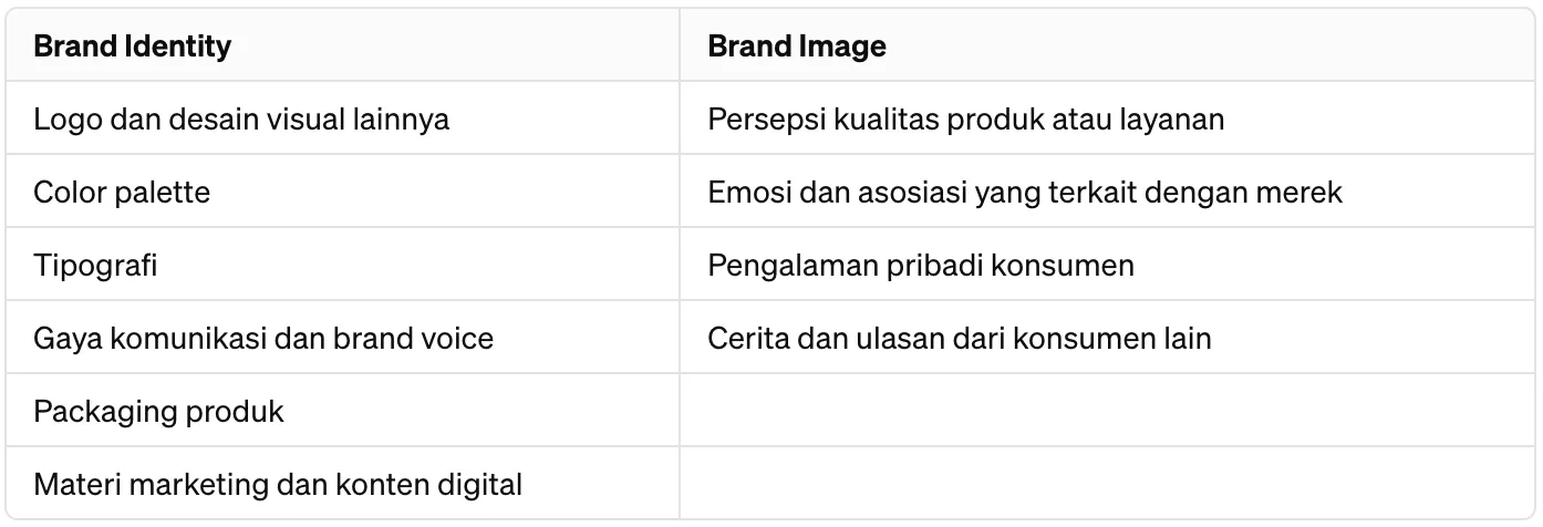 Brand image adalah bagaimana brand tersebut benar-benar dilihat oleh konsumen. Sementara brand identity adalah representasi visual dan konseptual yang ingin disampaikan oleh sebuah brand kepada publik. Ini adalah ekspresi dari bagaimana brand ingin dipersepsikan.