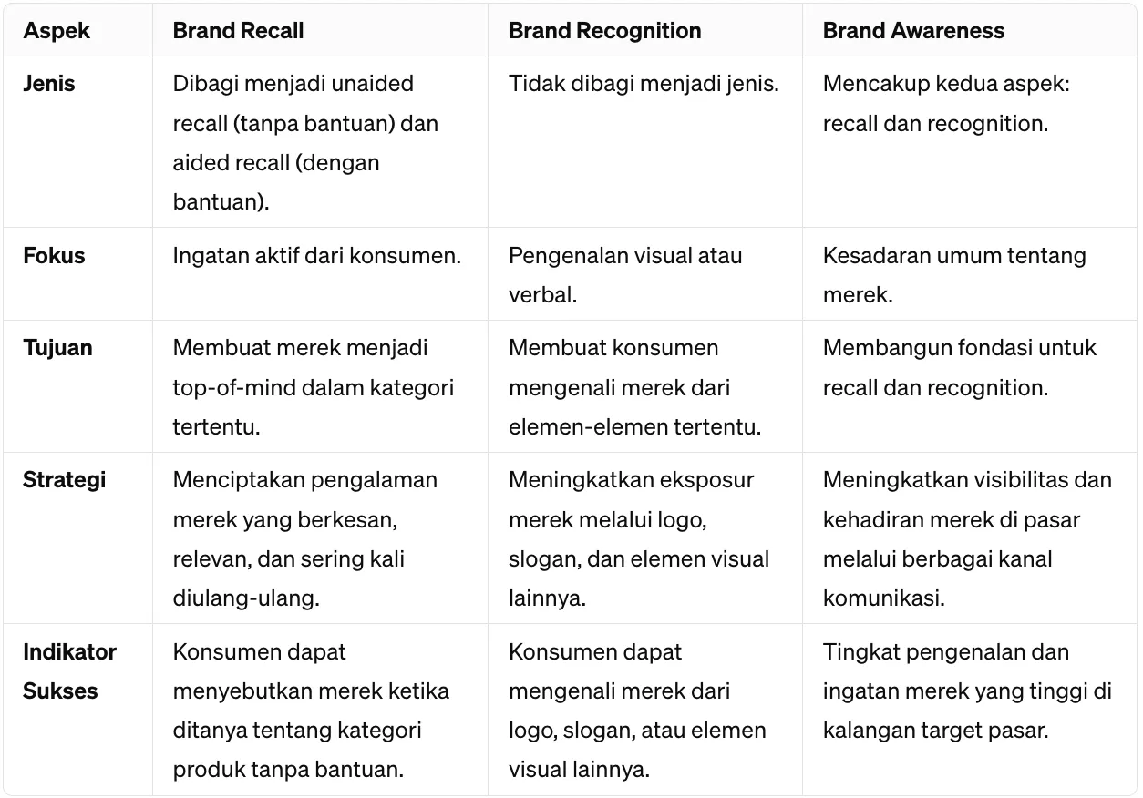 Perbedaan utama antara ketiga konsep ini terletak pada tingkat kedalaman ingatan dan pengenalan brand oleh konsumen. Brand recall membutuhkan ingatan aktif dari konsumen, brand recognition membutuhkan pengenalan visual atau verbal, dan brand awareness adalah kondisi awal yang memungkinkan kedua fenomena tersebut terjadi.