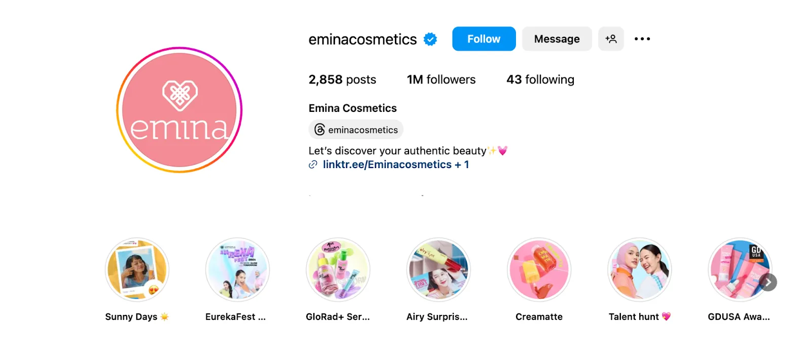 Emina Cosmetics brand merek kecantikan populer di Indonesia. Halaman Instagram mereka menampilkan produk kecantikan yang cerah dan campaign interaktif yang ditujukan untuk audiens muda.