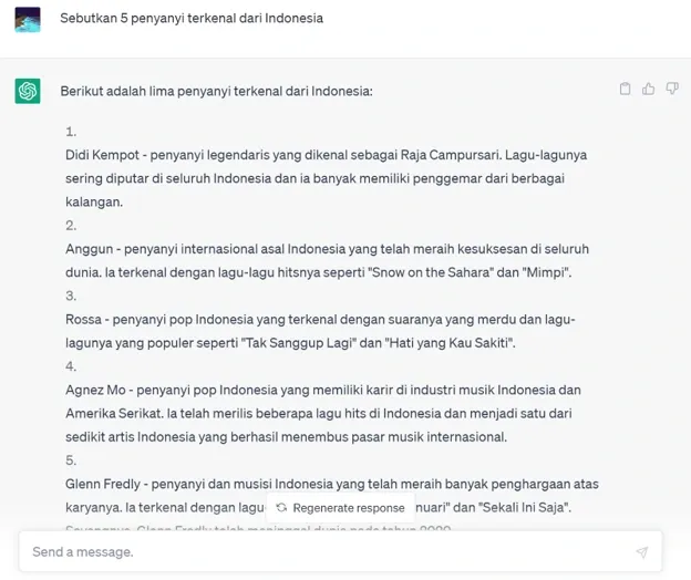 Dari contoh tersebut, Chat GPT memberikan list 5 penyanyi terkenal asal Indonesia karena permintaan pengguna yang dibuat.
