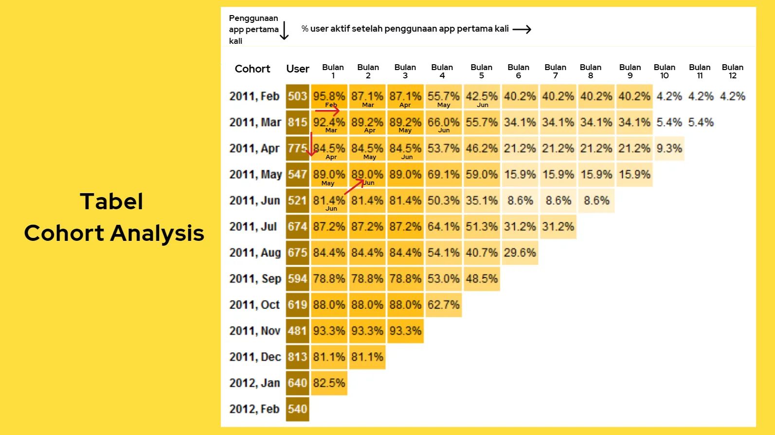 Pada tabel contoh, persentase user yang aktif tiap bulannya cenderung turun di tiap cohort.
