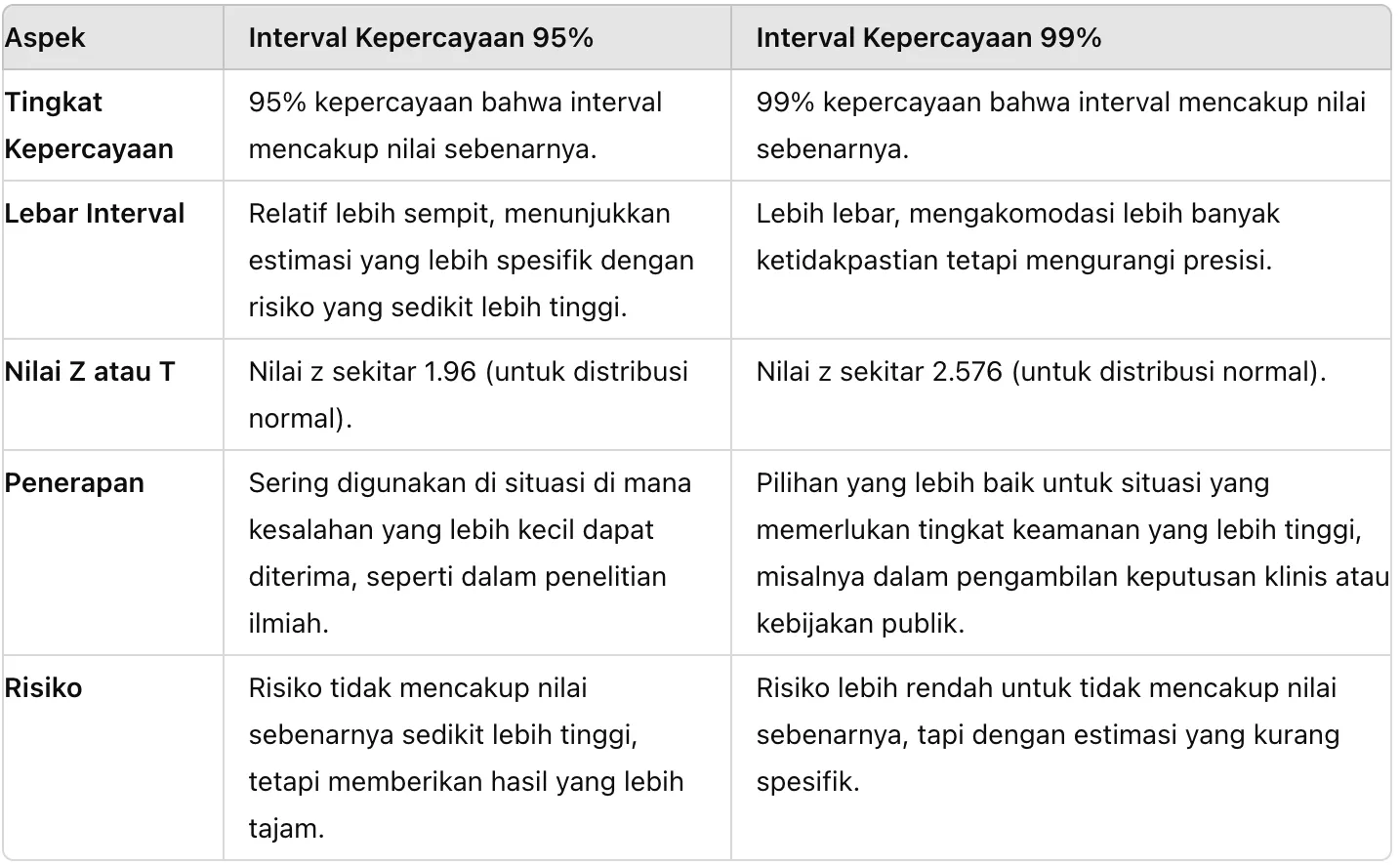 Sementara itu, CI 99% memberikan tingkat kepercayaan yang lebih tinggi, yaitu 99%. Artinya, jika pengukuran dilakukan 100 kali, 99 dari 100 interval kepercayaan yang dihasilkan diharapkan untuk mencakup nilai sebenarnya.