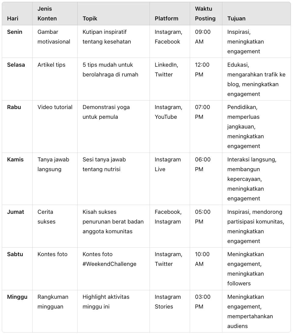 Berikut adalah contoh content plan mingguan untuk media sosial sebuah brand yang berfokus pada kesehatan dan kebugaran. Plan ini mencakup berbagai jenis konten untuk meningkatkan engagement dan interaksi dengan audiens.