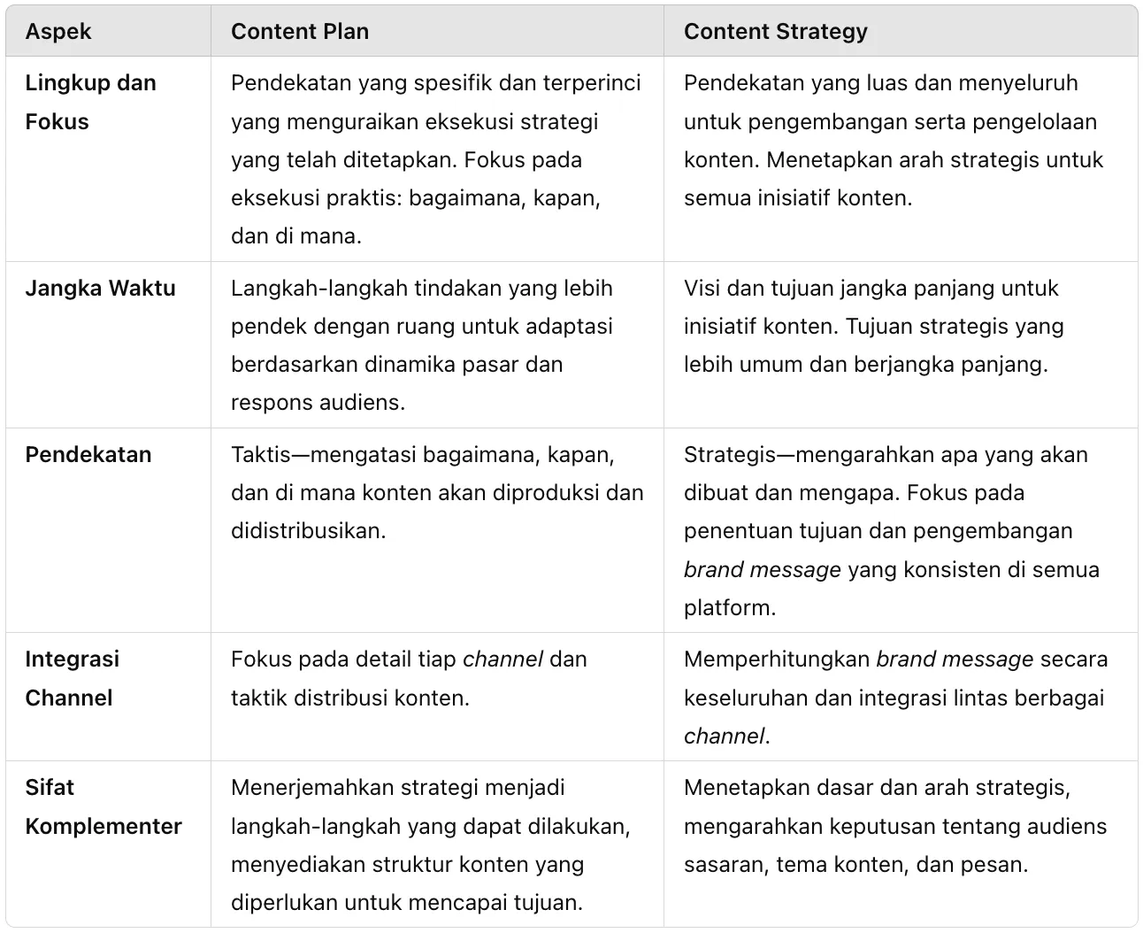 Lebih lanjut, inilah tabel perbedaan antara content strategy dan content plan: