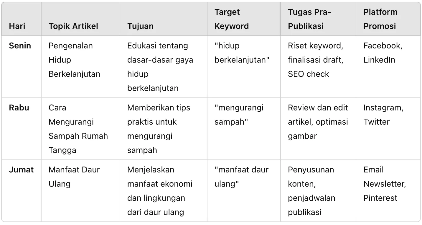 Contoh lain adalah content plan mingguan untuk artikel blog sebuah brand yang berfokus pada gaya hidup berkelanjutan. Plan ini mencakup strategi publikasi dan promosi untuk setiap artikel.