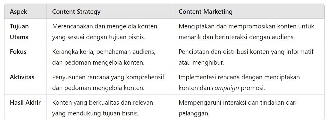 Berikut tabel yang merangkum perbedaan antara content strategy dan content marketing: