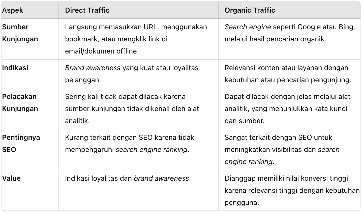 Meskipun begitu, direct traffic sangat penting karena menunjukkan tingkat awareness dan kesetiaan terhadap brand atau situs, yang mencerminkan pengunjung tersebut sudah memiliki pengetahuan atau kesan positif sebelumnya terhadap situs yang dikunjungi.