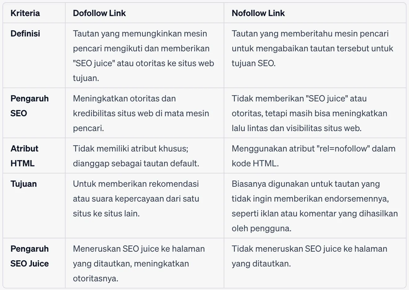 Lebih lanjut, berikut tabel perbedaan dofollow link dan nofollow link: