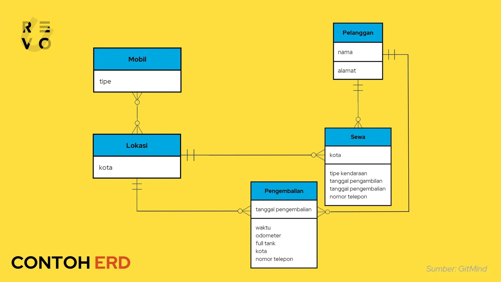 Berikut ini adalah contoh ERD dari sebuah sistem perusahaan rental mobil yang menggambarkan entitas (seperti mobil, lokasi, pelanggan, sewa, dan pengambilan), atribut (seperti tipe, kota, nama, dan alamat), beserta hubungannya: