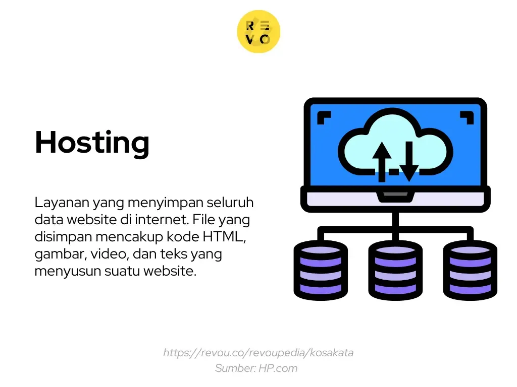 HP.com mendefinisikan hosting adalah layanan yang menyimpan seluruh data website di internet. File yang disimpan mencakup kode HTML, gambar, video, dan teks yang menyusun suatu website.
