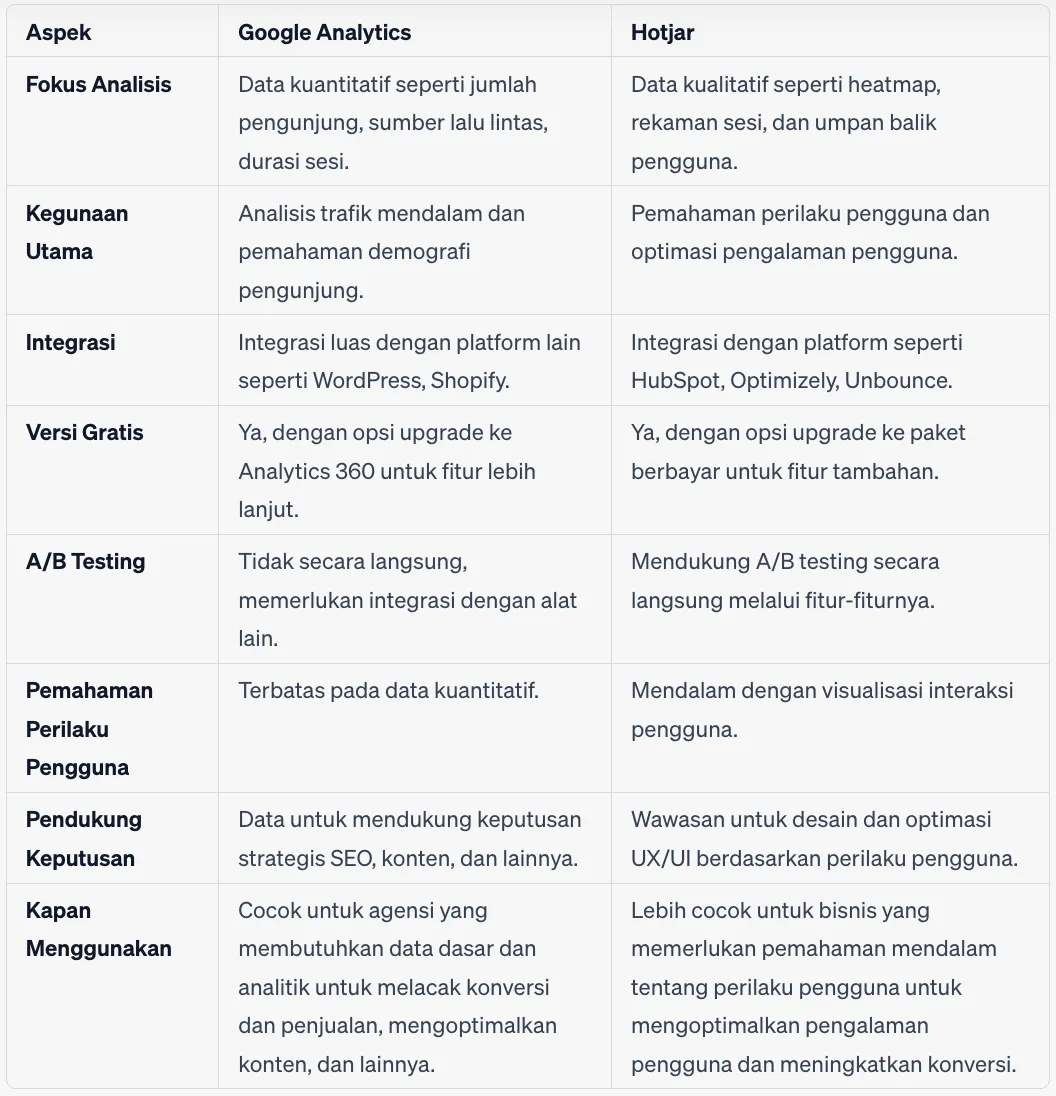 Lebih lengkap, berikut tabel perbedaan Hotjar vs Google Analytics: