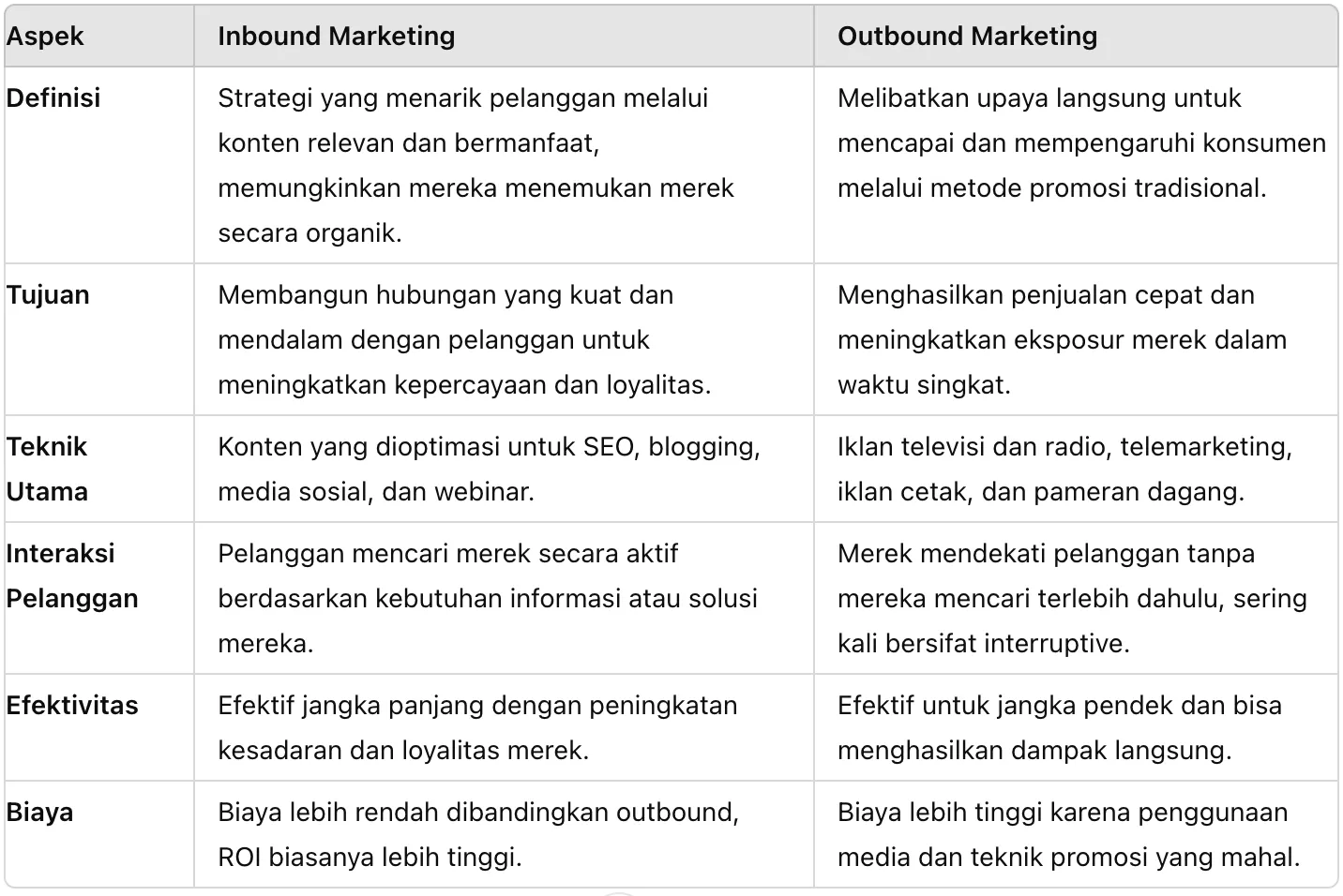 Lebih lanjut, inilah tabel perbandingan antara inbound marketing dan outbound marketing: