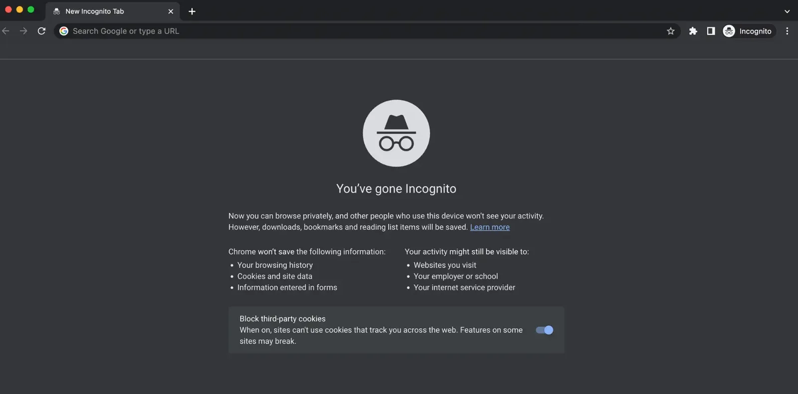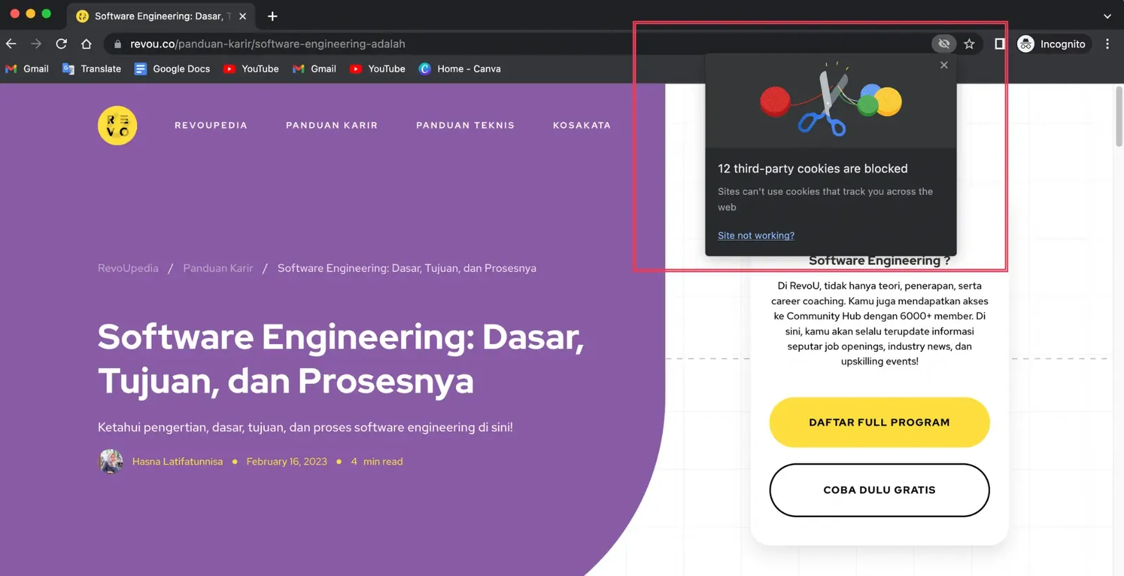 Saat user mengunjungi website, mode incognito akan memberitahu bahwa semua cookie akan diblokir dan website tidak bisa menggunakan cookie untuk melacak aktivitas user.