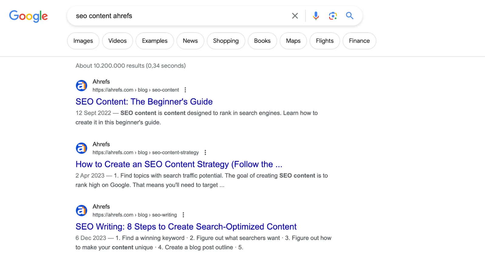 Di atas adalah hasil pencarian Google untuk query "seo content ahrefs".
