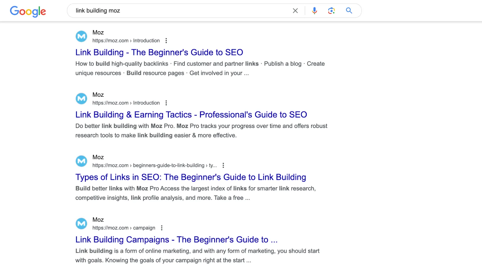 Contoh lainnya adalah hasil pencarian Google untuk query "link building moz".