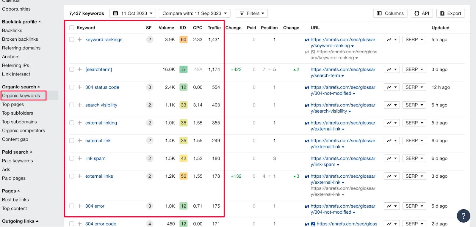 Hasil yang akan muncul adalah list keyword yang memiliki volume dan ranking tinggi di website milik kompetitor.