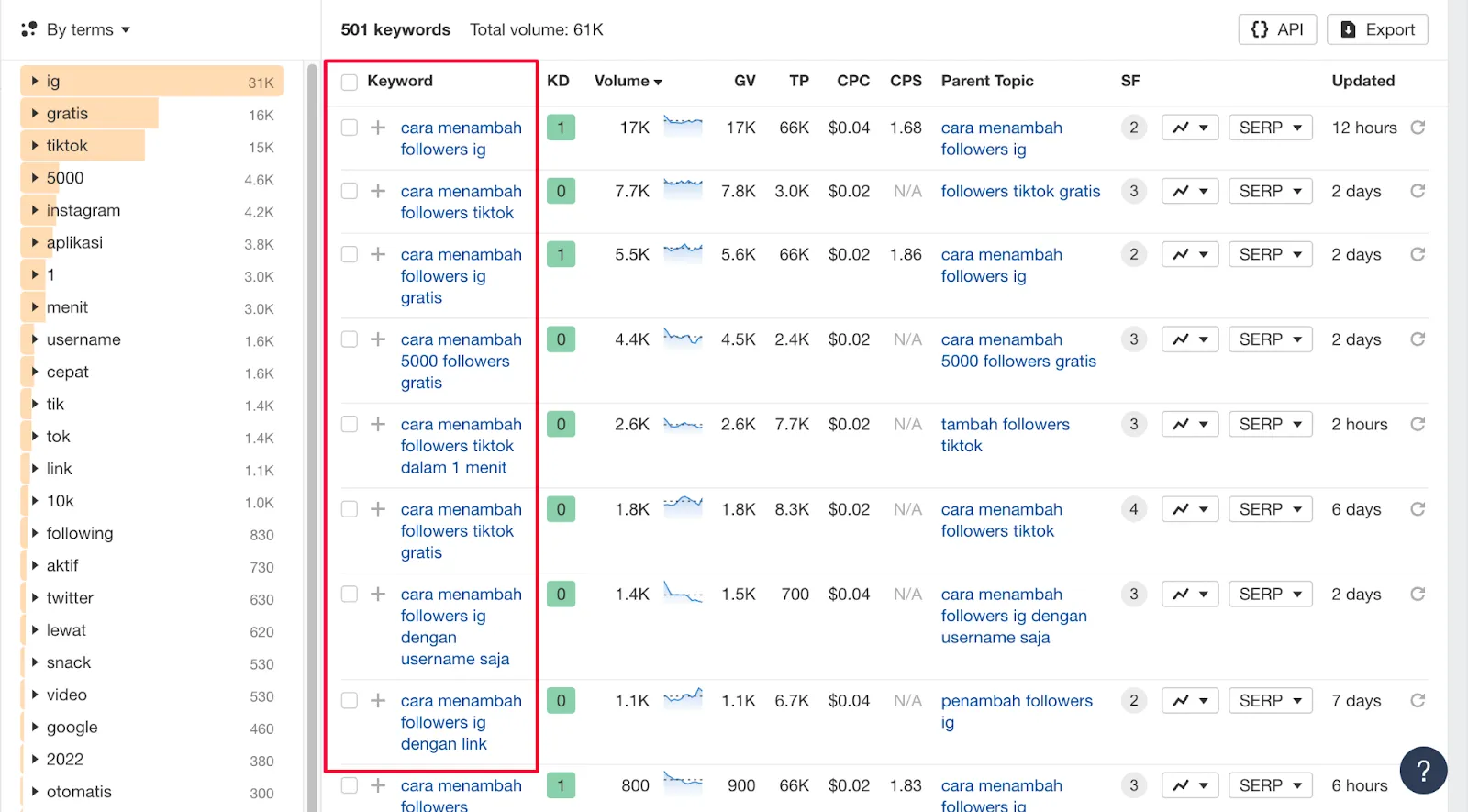 Diversifikasi kata kunci: keyword generator menawarkan berbagai saran kata kunci terkait, memungkinkan lebih banyak variasi dalam membuat konten dan strategi pemasaran.