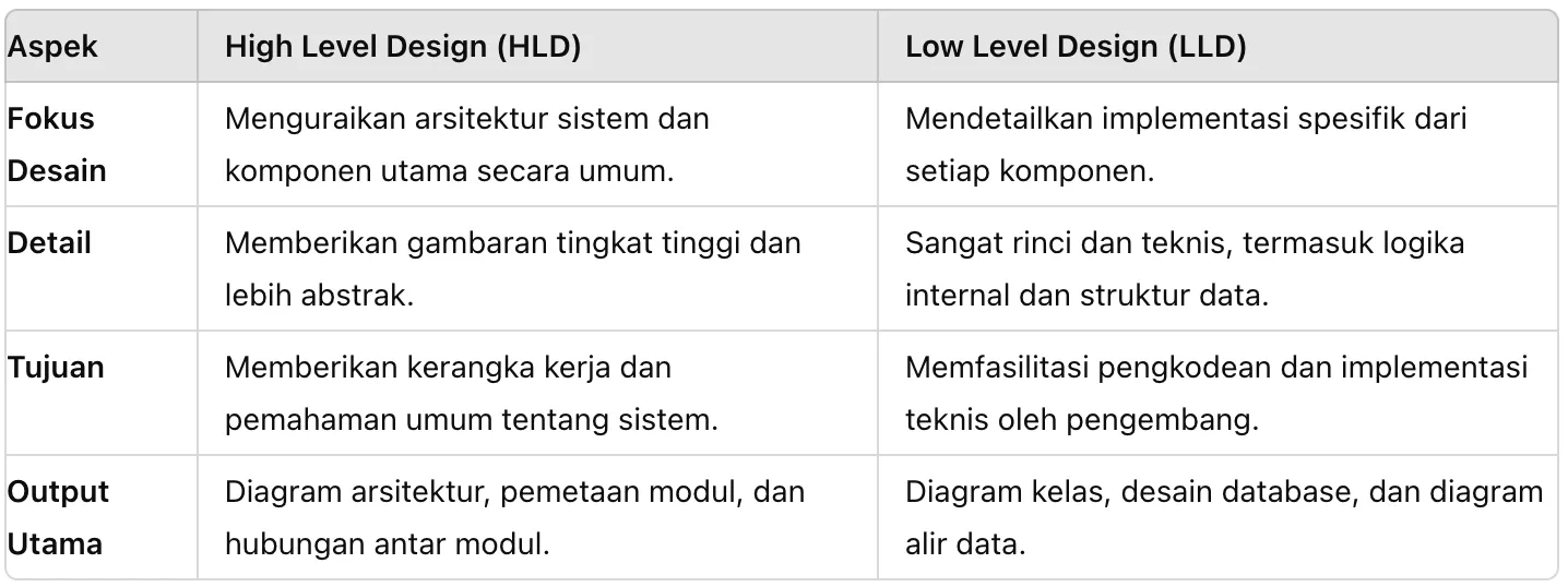 HLD adalah tahap yang menguraikan arsitektur dan komponen utama sistem secara umum, fokus pada struktur besar dan hubungan antar modul. Di sisi lain, LLD mendetailkan implementasi spesifik dari setiap komponen yang diidentifikasi dalam HLD, termasuk logika internal, struktur data, dan detail teknis coding.