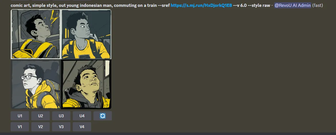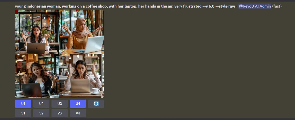 U1 sampai U4 adalah opsi untuk upscaling atau meningkatkan resolusi gambar yang dihasilkan. Setiap pilihan menawarkan tingkat peningkatan berbeda atau variasi dalam detail yang ditingkatkan.