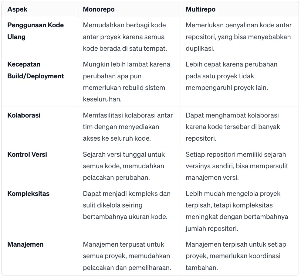 Lebih lanjut, berikut tabel perbedaan monorepo dan multi repo:
