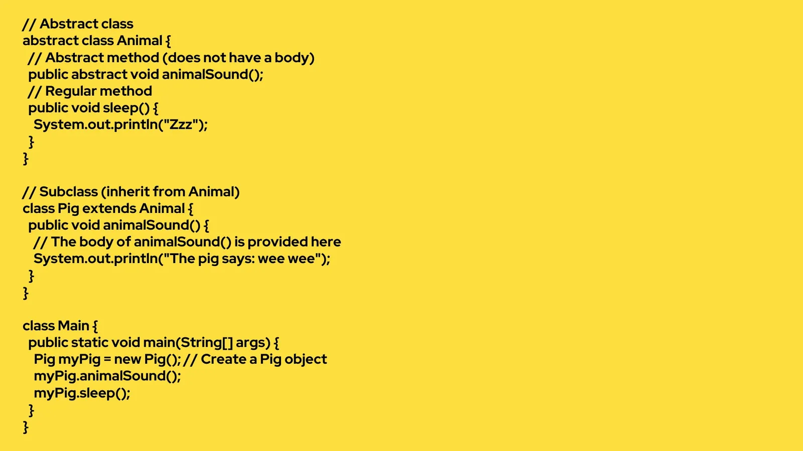 Kode di bawah ini adalah contoh abstraction. Kelas abstrak (Animal) memiliki metode abstrak (animalSound()) tanpa menentukan implementasinya. Subkelas (Pig) mewarisi kelas abstrak tersebut dan menerapkan metode animalSound().