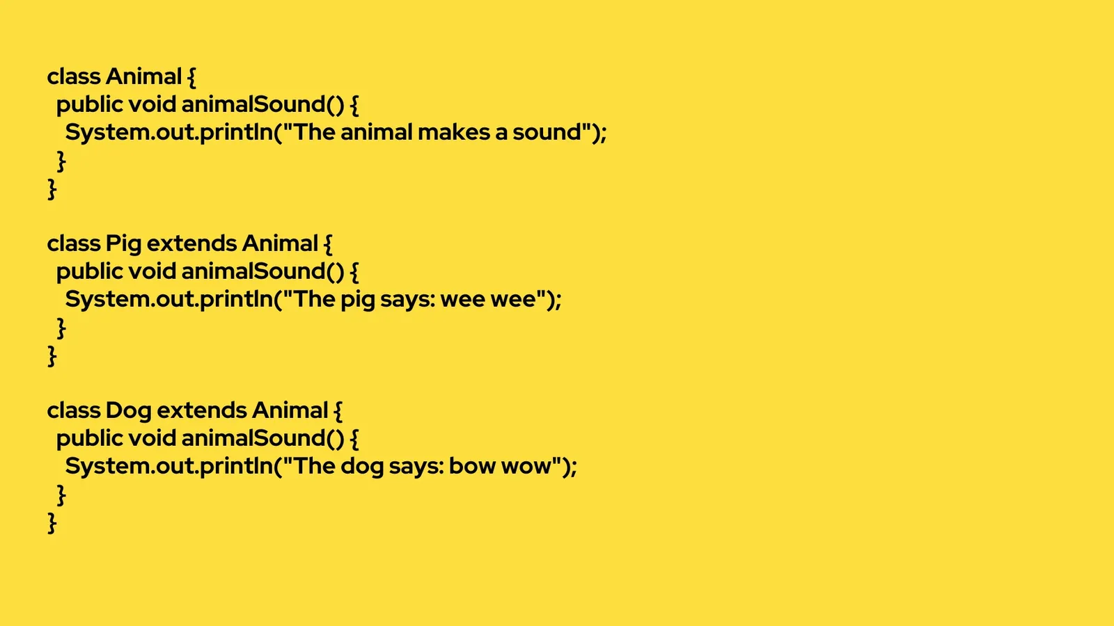 Meskipun "Pig" dan "Dog" adalah subkelas dari "Animal", mereka memiliki implementasi yang berbeda dari metode "animalSound()".