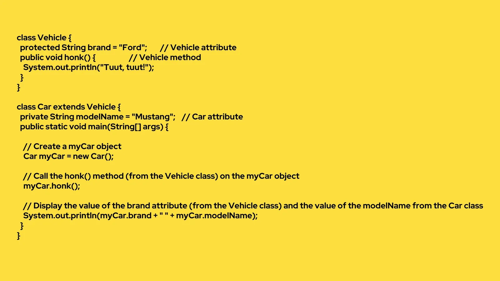 Pada contoh kode di bawah ini, ada dua kelas: Vehicle dan Car. Kelas Car adalah subkelas dari kelas Vehicle, yang berarti akan mewarisi semua karakteristik dan metode kelas Vehicle. Kelas Vehicle memiliki atribut 'brand' dan metode 'honk' yang menampilkan "Tuut, tuut!".