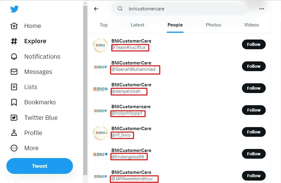 Di atas adalah berbagai akun yang mengatasnamakan BNI Customer Care. Namun, username akun-akun tersebut tidaklah resmi. Mereka berupaya menjawab tweet keluhan customer seperti berikut.