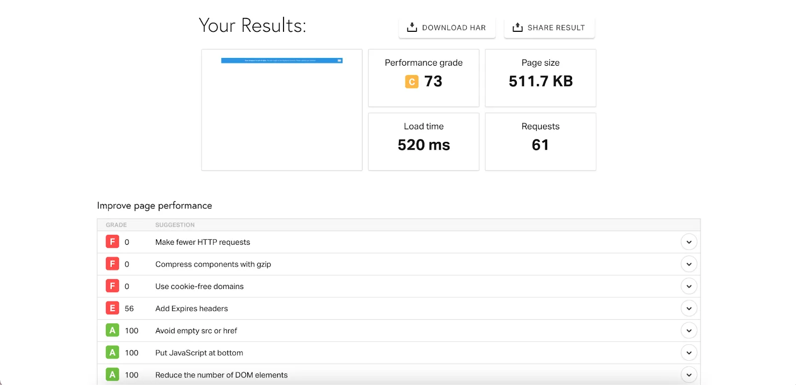 Di bagian bawah, terdapat rekomendasi untuk meningkatkan performa, seperti mengurangi jumlah permintaan HTTP, mengompres komponen dengan gzip, dan menggunakan domain tanpa cookie.