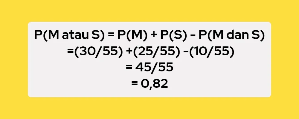P (A atau B) merupakan probabilitas kejadian A atau B. P(A) adalah probabilitas kejadian A terjadi, dan P(B) adalah probabilitas dari kejadian B. Sementara itu, P(A dan B) adalah probabilitas kedua peristiwa terjadi secara bersamaan.