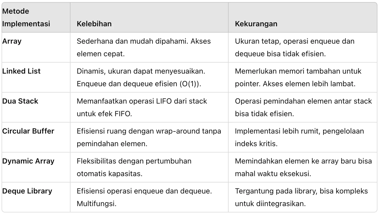 Queue dapat diimplementasikan dengan beberapa cara berbeda, masing-masing memiliki kelebihan dan kekurangannya sendiri tergantung pada kebutuhan spesifik aplikasi atau lingkungan pengembangan.