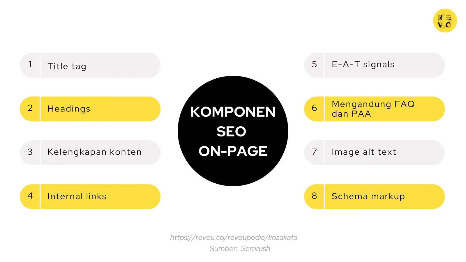 Semrush telah merangkum komponen penting dalam SEO on-page, antara lain:
