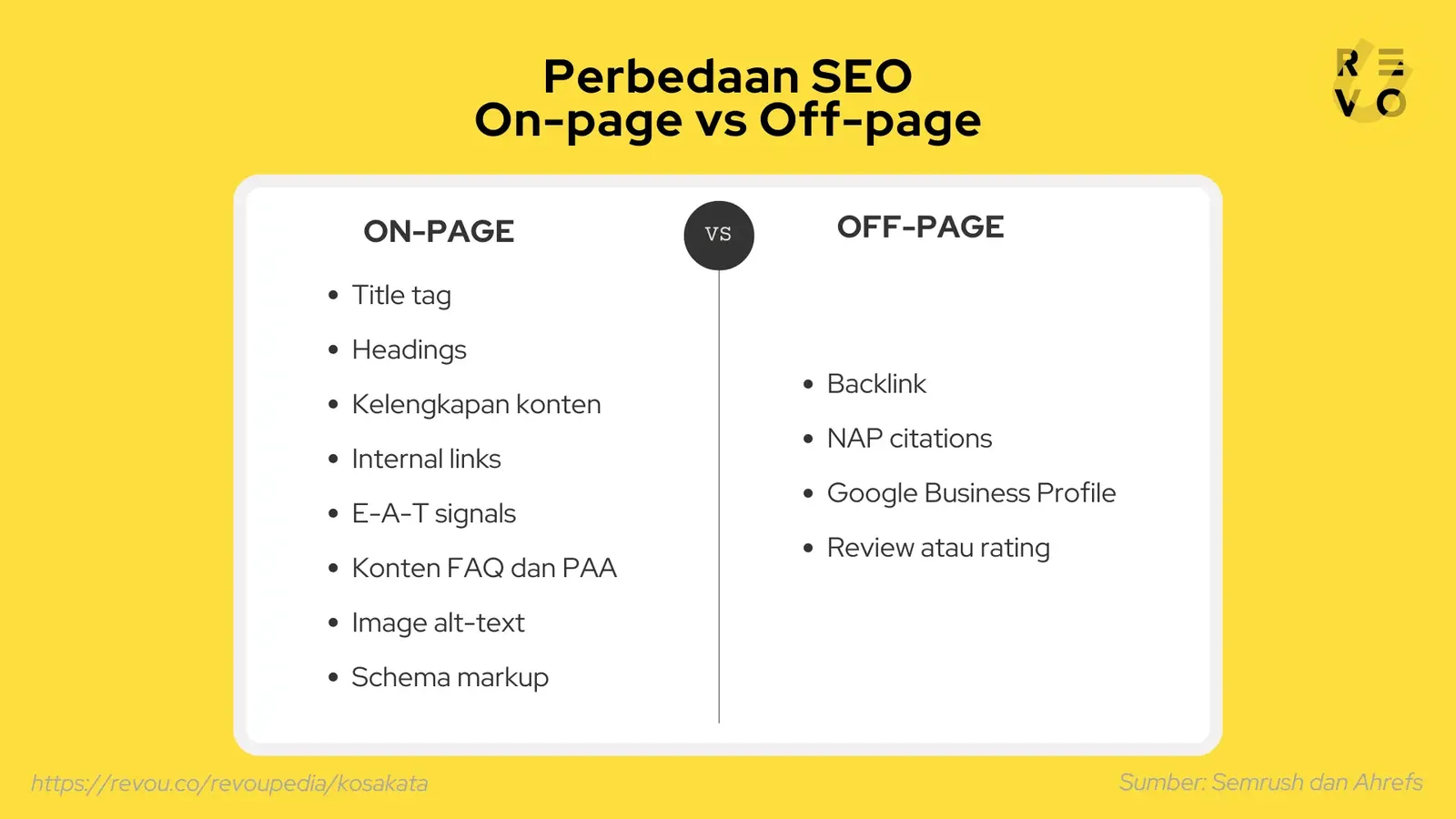 SEO on-page berfokus optimasi konten yang ada di halaman itu sendiri. Sementara SEO off-page mengacu pada kegiatan di luar halaman web untuk mendapatkan ranking. SEO off-page berkaitan dengan backlink, optimasi melalui media sosial, peningkatan brand awareness, newsletter, dan lainnya.