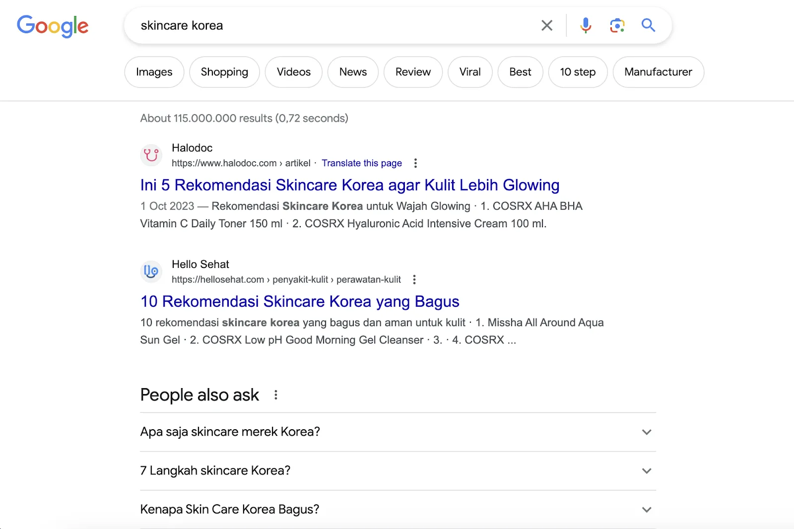Di atas adalah hasil pencarian yang muncul dengan keyword “skincare korea”. SERP menampilkan konten organik tentang rekomendasi skincare korea dan PAA (people also ask) di bawahnya.