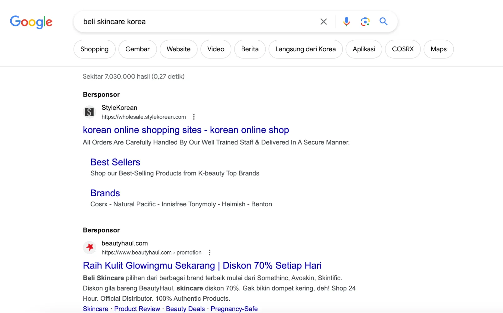 Contoh lain adalah penggunaan keyword “beli skincare korea”. Hasil yang muncul di SERP ranking teratas adalah website milik e-commerce bertuliskan “Bersponsor”.