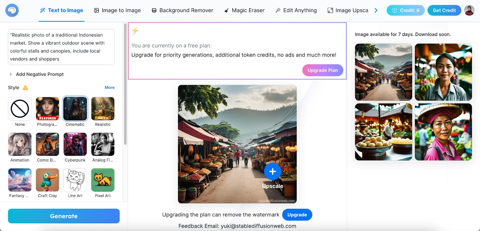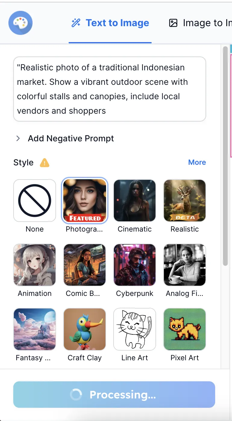 Contoh di atas menggunakan fitur Text to Image untuk mengubah deskripsi menjadi gambar visual. Ada beberapa style yang dapat dipilih, seperti cinematic, realistic, animation, dan sebagainya.