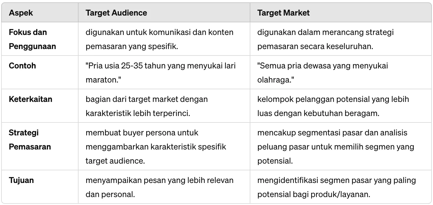 Lebih lanjut, berikut tabel perbedaan target audience dan target market: