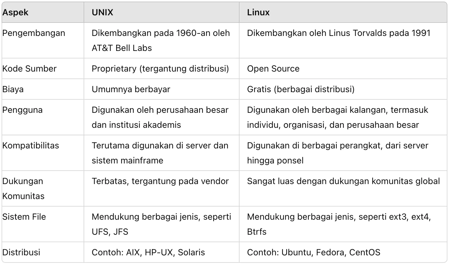 UNIX adalah sistem operasi yang dikembangkan pada akhir 1960-an di Bell Labs, dikenal karena stabilitas, keamanan, dan kemampuannya mendukung multitasking dan multiuser.