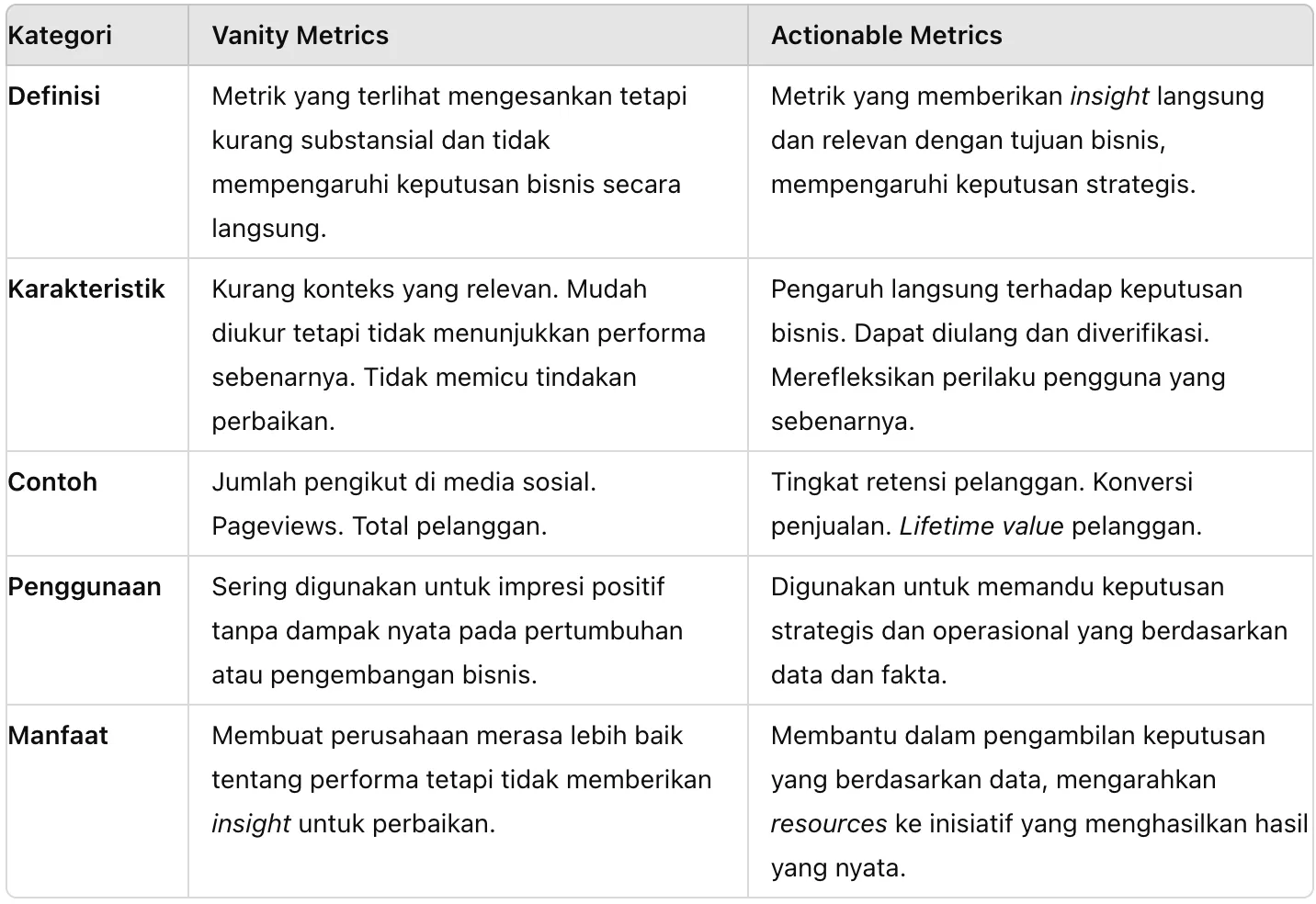 Berikut perbedaan antara vanity metrics dan actionable metrics: