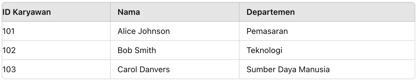 Misalnya, ada database karyawan di mana setiap karyawan memiliki ID unik, nama, dan departemen. Analyst ingin mencari nama karyawan berdasarkan ID mereka.
