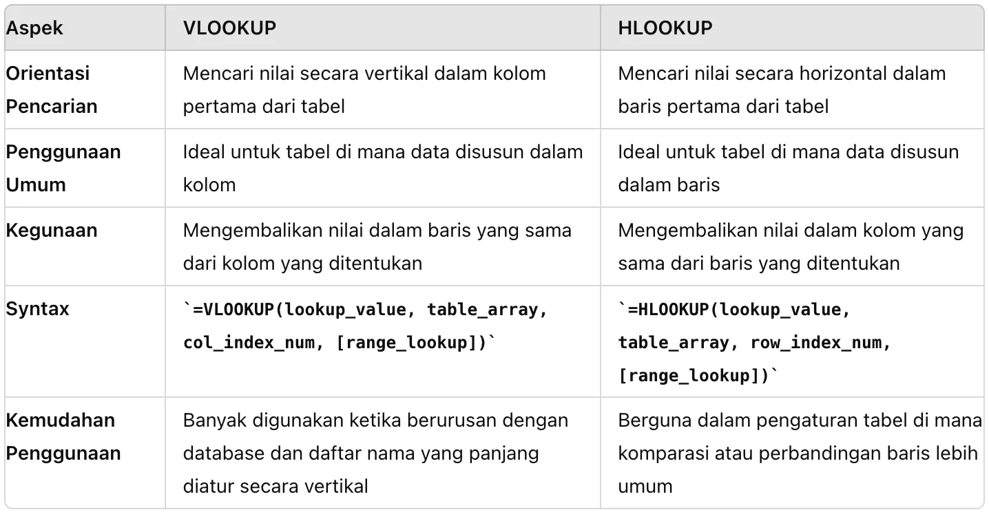 Berikut tabel yang menjelaskan perbedaan antara fungsi VLOOKUP dan HLOOKUP di Excel: