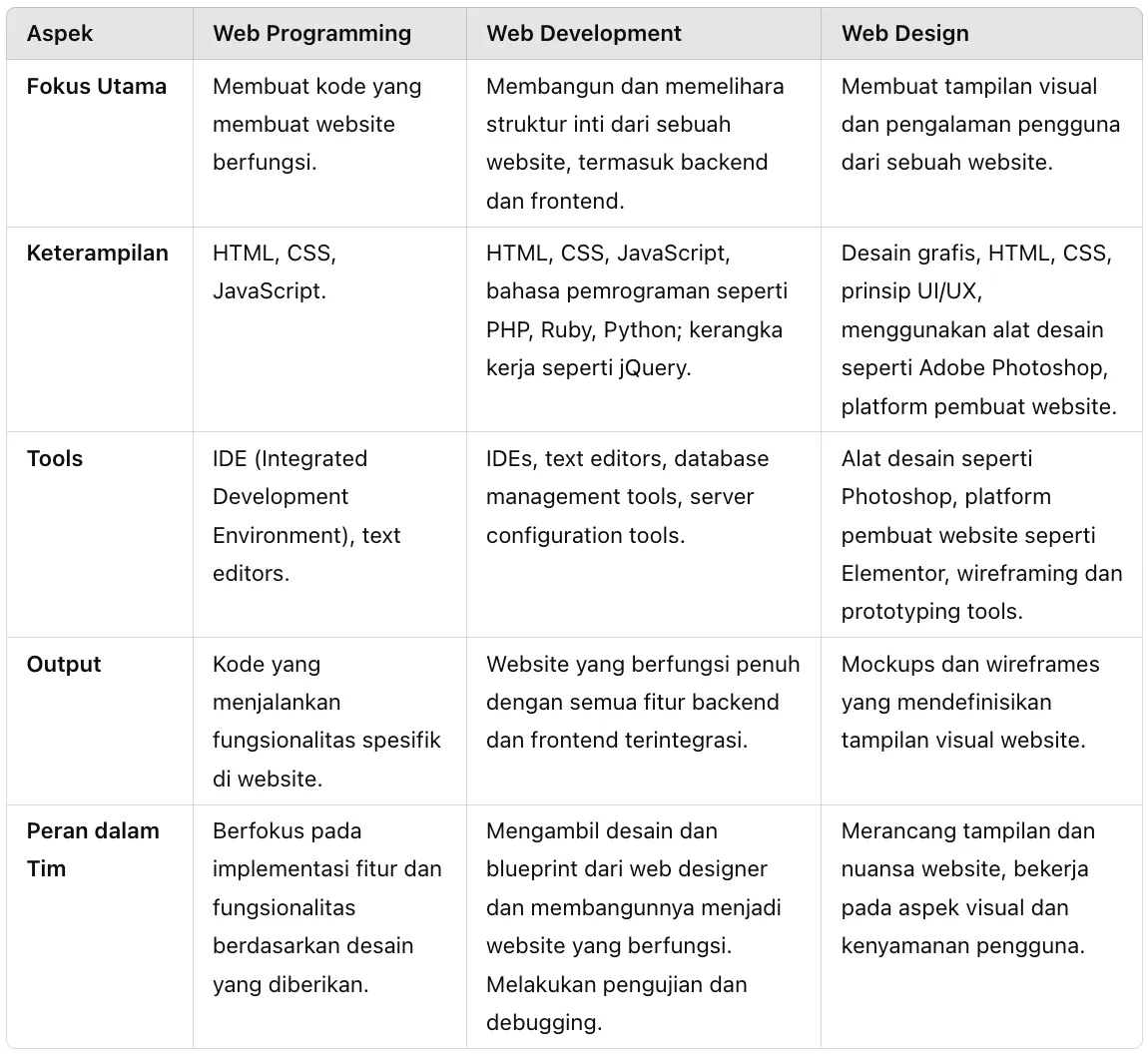 Berikut tabel yang merangkum perbedaan antara web programming, web development, dan web design: