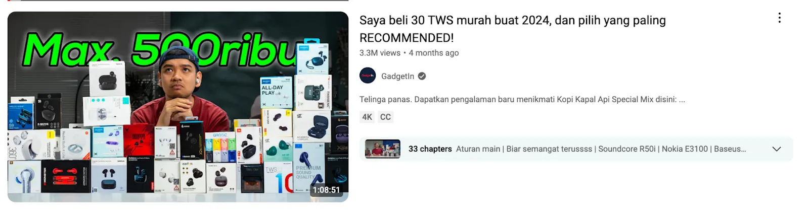 Contoh berikutnya berkaitan dengan review dan rekomendasi gadget dengan anggaran maksimal 500 ribu rupiah, berjudul "Saya beli 30 TWS murah buat 2024, dan pilih yang paling RECOMMENDED!".