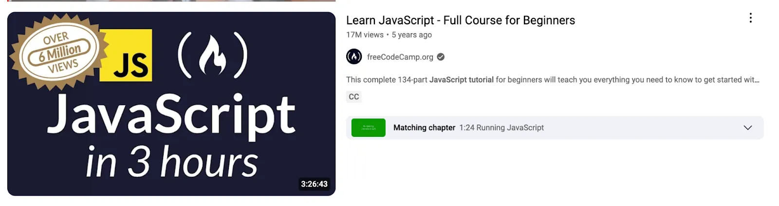 Di atas adalah video tutorial yang menawarkan kursus lengkap JavaScript untuk pemula, berjudul "Learn JavaScript - Full Course for Beginners". Thumbnail-nya menampilkan logo JavaScript yang besar dan ikon api, menunjukkan ini adalah kursus yang "hot" atau populer.